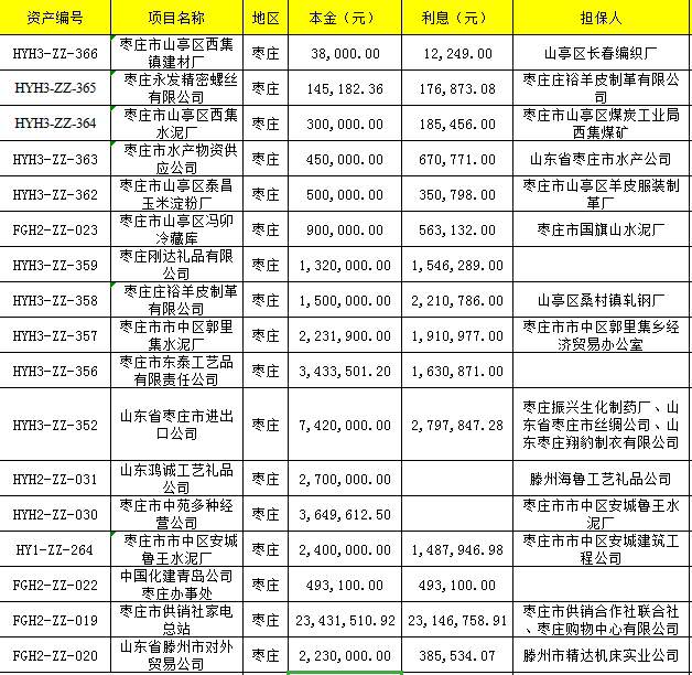 | 13 | HYH2-ZZ-030 | 枣庄市中苑多种经营公司 | 枣庄 | 3,649,612.50 | 枣庄市市中区安城鲁王水泥厂 | 已诉,申请执行 | |